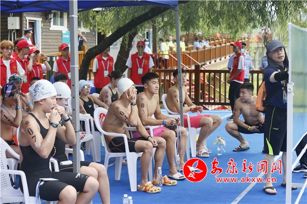 清晨的瀛湖翠屏島四周波平如鏡,遠處山嵐淡淡的煙云漸漸消散。島南側觀禮臺正前方浮臺上早已劃定了起終點的位置,四個橙色漂浮標志固定在浮臺遠處西側、西南側、南側、東側四點,分別被稱為賽事1、2、3、4號浮標標志,這就是即將舉行測試賽的賽場賽道:運動員經浮臺西側的起點出發,依次繞過4個浮標標志,游回浮臺南面完成一圈1.67km,本次賽事測試賽和公開賽同時發令入水,3km公開賽游兩圈,10km測試賽游6圈,都從浮臺東側沖刺上岸、完成比賽。