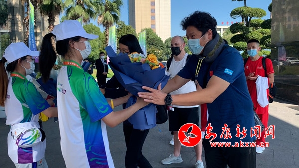 “各位領(lǐng)隊(duì)、教練、運(yùn)動員,歡迎來到陜西省安康市參加十四運(yùn)會馬拉松游泳項(xiàng)目比賽。我代表競委會向大家表示熱烈的歡迎,祝大家在安康參賽期間工作順利、生活愉快、勇創(chuàng)佳績。”隨后,現(xiàn)場志愿者向報(bào)到的運(yùn)動隊(duì)送上鮮花。