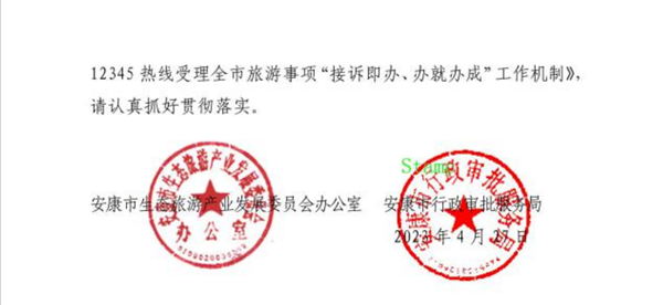 為推動我市生態旅游產業高質量發展,確保廣大來安游客合法權益,按照《中共安康市委安康市人民政府關于加快生態旅游產業高質量發展的實施意見》(安發〔2022〕17號)文件精神,經市旅發委辦公室、市行政審批服務局研究,決定建立《安康市12345熱線受理全市旅游事項“接訴即辦、辦就辦成”工作機制》,請認真抓好貫徹落實。