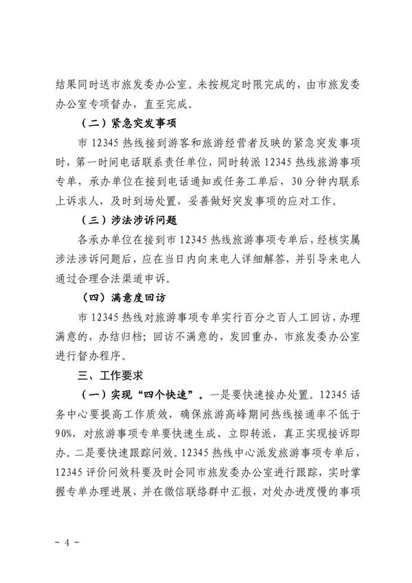 (一)實現“四個快速”。一是要快速接辦處置。12345話務中心要提高工作質效,確保旅游高峰期間熱線接通率不低于90%,對旅游事項專單要快速生成、立即轉派,真正實現接訴即辦。二是要快速跟蹤問效。12345熱線中心派發旅游事項專單后,12345評價問效科要及時會同市旅發委辦公室進行跟蹤,實時掌握專單辦理進展,并在微信聯絡群中匯報,對處辦進度慢的事項進行督辦問效。三是要快速正面報道。對旅游事項專單辦理較好的案例要快速正面報道;將原本發生的旅游負面事件妥善處置,轉化為對旅游問題快速辦理的正面典型。四是要快速改善旅游環境。各承辦單位在辦理完游客或旅游經營者的投訴專單后,要舉一反三,對相同或類似問題進行自查整改,杜絕相同事件的重復發生,打造優質的旅游環境。