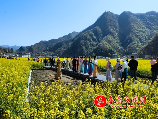 活動(dòng)現(xiàn)場,旬陽市仁河口鎮(zhèn)水泉坪景區(qū)萬畝油菜花海在陽光照耀下嬌俏迷人,和煦春風(fēng)拂面而來,花海泛起層層疊疊的金色浪潮,濃郁的花香令人沉醉,絡(luò)繹不絕的觀眾和游客不時(shí)駐足拍照。精彩的文藝演出更是輪番上演,歌曲《油菜花開了》《旬陽人》、表演唱《庭院經(jīng)濟(jì)富農(nóng)家》、舞蹈《盛世花開》《家鄉(xiāng)的油菜花》《春頌》、嗩吶獨(dú)奏《百鳥朝鳳》、音樂快板《紅色傳承譜華章》、大筒子小戲《勸賭》等節(jié)目,讓觀眾目不暇接、贊不絕口,為景區(qū)增添了文化內(nèi)涵、營造了藝術(shù)氛圍、給繁花似錦的油菜花海注入了生機(jī)活力。