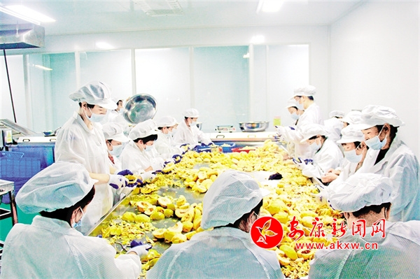 中廠鎮石梯社區木瓜產業園區里工人們為木瓜去皮。王茜 攝