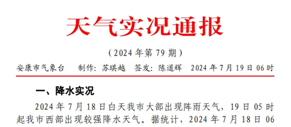 2024年7月19日10時18分接到省應急廳第192號《暴雨橙色預警》:預計未來3小時我市漢濱區、寧陜縣降雨量將達50 毫米以上,未來6小時我市漢陰縣、石泉縣、旬陽市、白河縣將達50毫米以上,以上地區境內發生山洪、泥石流等災害風險較高。
