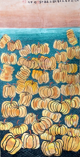 畫面上緊密排列的南瓜,給人一種飽滿、充實的視覺感受,顯示了收獲的豐盛,也表達出一種對富足生活的滿足和喜悅之情。汪佳涵選擇了家鄉常見的農作物作為自己的繪畫主題,直白地表達了對家鄉的認可和贊美,展示了她對家鄉生活的認同和熱愛。