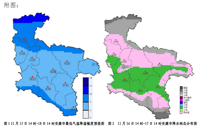 受冷空氣影響,15—17日全市過程日最低氣溫下降8~10℃,最低氣溫將出現在18日和19日清晨,全市大部會出現今冬初霜凍。預計最低氣溫:川道地區-4~2℃,中高山地區-8~-4℃,秦巴高山局地低于-8℃。16日夜間至17日白天我市大部有明顯吹風天氣,陣風可達5—6級。