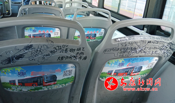 7月7日,筆者乘坐安康市城區7路公交車發現,公交座椅靠背慘遭“涂鴉”,內容不乏廣告標語、低俗粗鄙、不堪入目的語言,嚴重影響乘車心情。希望廣大乘客文明乘車,還市民一個干凈整潔的乘車環境。(通訊員 成忠旭)siz安康新聞網