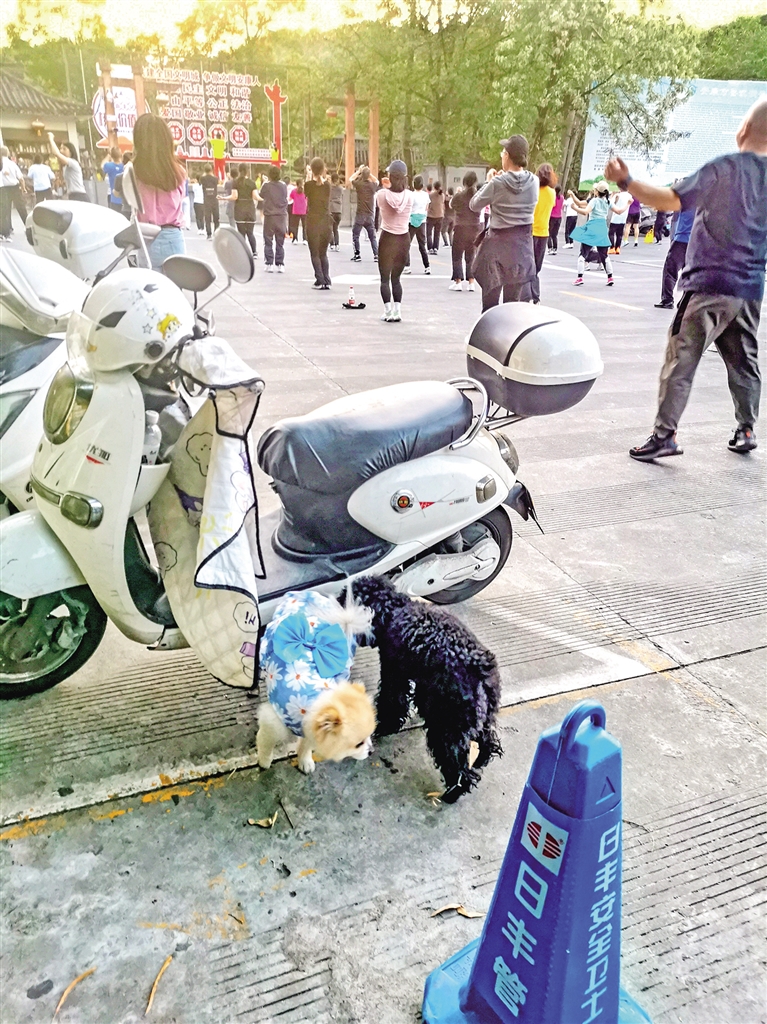 4月17日,在安康香溪洞景區廣場,有市民遛狗不牽繩。