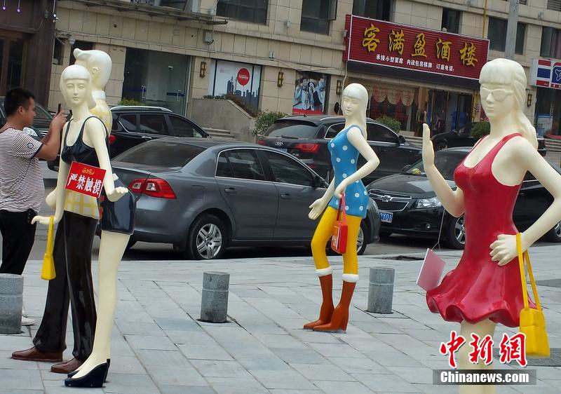 2014年8月6日,湖北宜昌市桔城路福久源商業(yè)街廣場上塑起4個嶄新的時尚模特塑像,其中3個“胸器”誘人的性感女模特塑像身上掛出了“嚴禁觸摸”提示牌。……