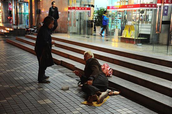2013年11月4日,蘇州某地街頭,乞討人員在新華書(shū)店前“交流”心得。 東方IC 圖職業(yè)乞討人員每天的收入大約能有四五百元,每月的收入起碼過(guò)萬(wàn);救助站工作人員甚至……