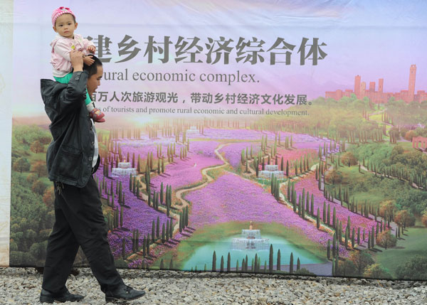 10月22日,重慶市渝北區興隆鎮,當地村民帶著小孩在奠基儀式現場參觀效果圖。當日,重慶“五谷地意大利休閑度假農場”正式破土動工。該項目按照意大利風格設計,……
