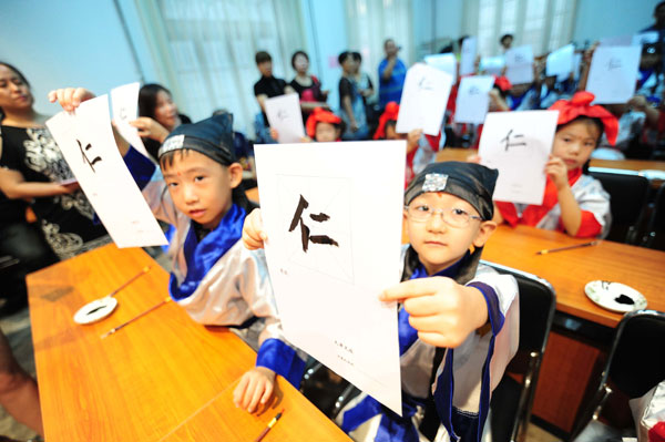 8月28日,天津市河西區(qū)馬場(chǎng)道小學(xué)的一年級(jí)新生在天津文廟開(kāi)筆典禮上“擊鼓鳴志”。新學(xué)期伊始,天津市河西區(qū)馬場(chǎng)道小學(xué)的92名一年級(jí)新生身穿古典服飾,在天津文廟……