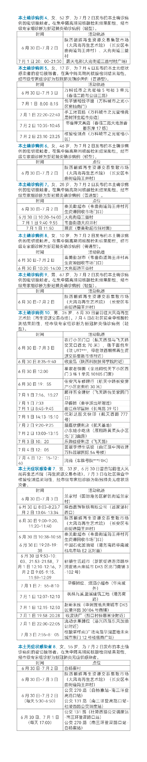 7月4日0-24時(shí),西安市新增7例本土確診病例,2例本土無癥狀感染者,7例在集中隔離中發(fā)現(xiàn),2例在社區(qū)篩查中發(fā)現(xiàn)。主要活動軌跡如下: