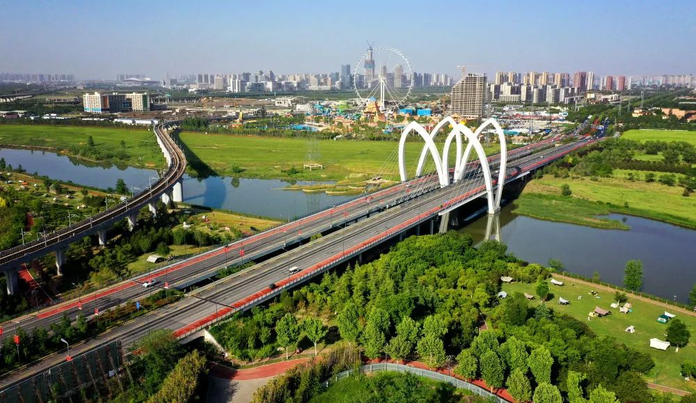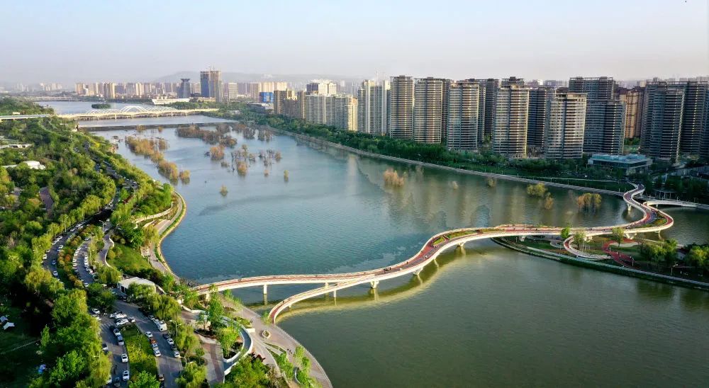 ↑西咸新區(qū)灃河兩岸景象(4月29日攝,無(wú)人機(jī)照片)。新華社記者 劉瀟 攝