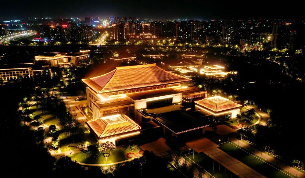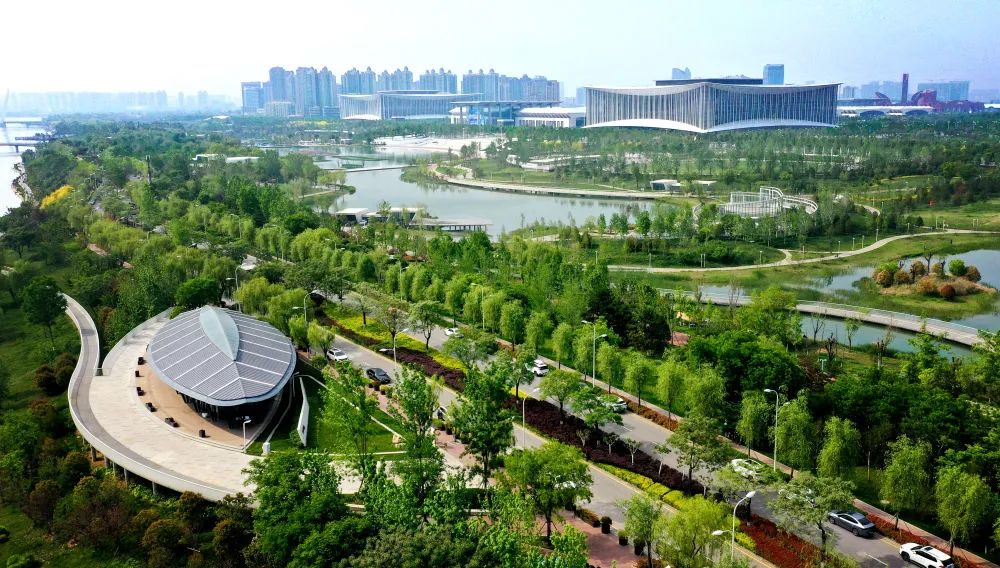 ↑位于西安浐灞生態(tài)區(qū)的西安國(guó)際會(huì)議中心(4月16日攝,無(wú)人機(jī)照片)。新華社記者 劉瀟 攝