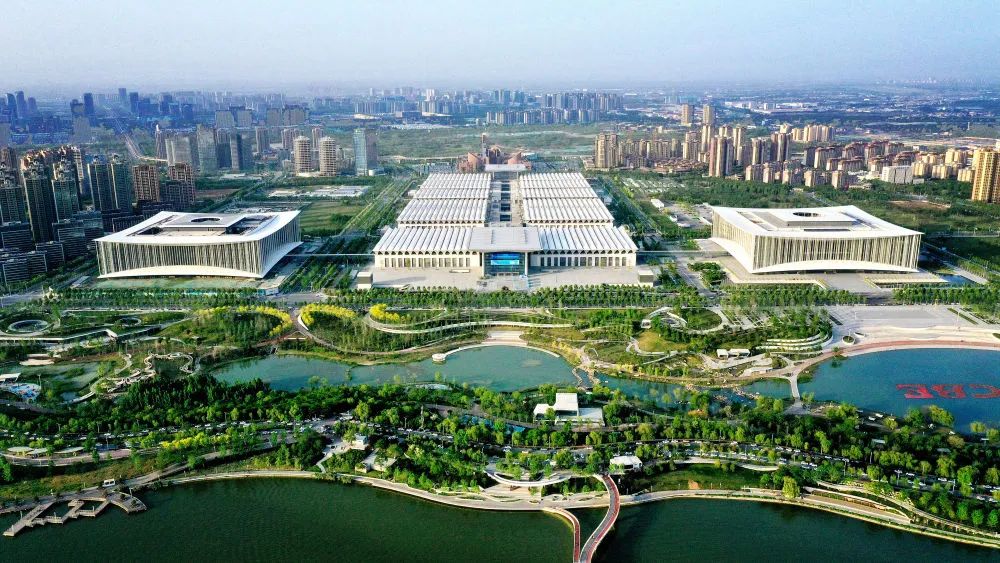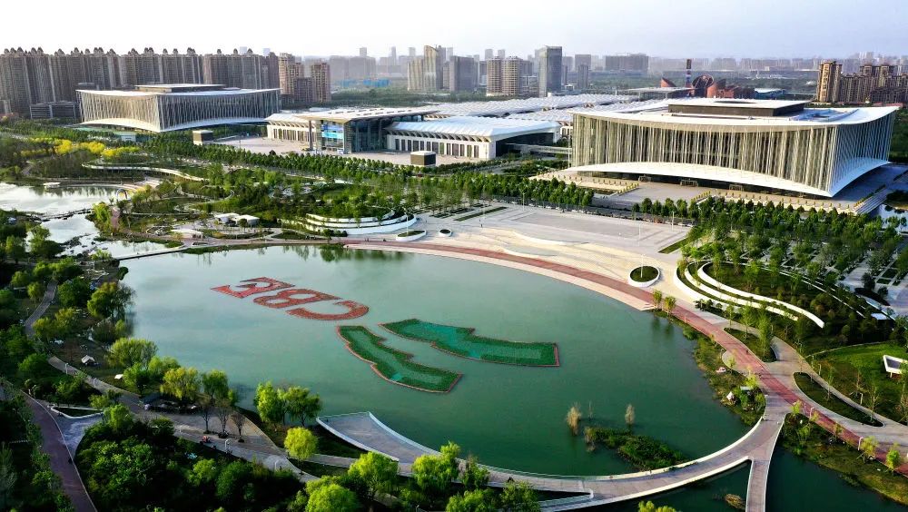 ↑位于西安浐灞生態(tài)區(qū)的西安國(guó)際會(huì)展中心(4月16日攝,無(wú)人機(jī)照片)。新華社記者 劉瀟 攝