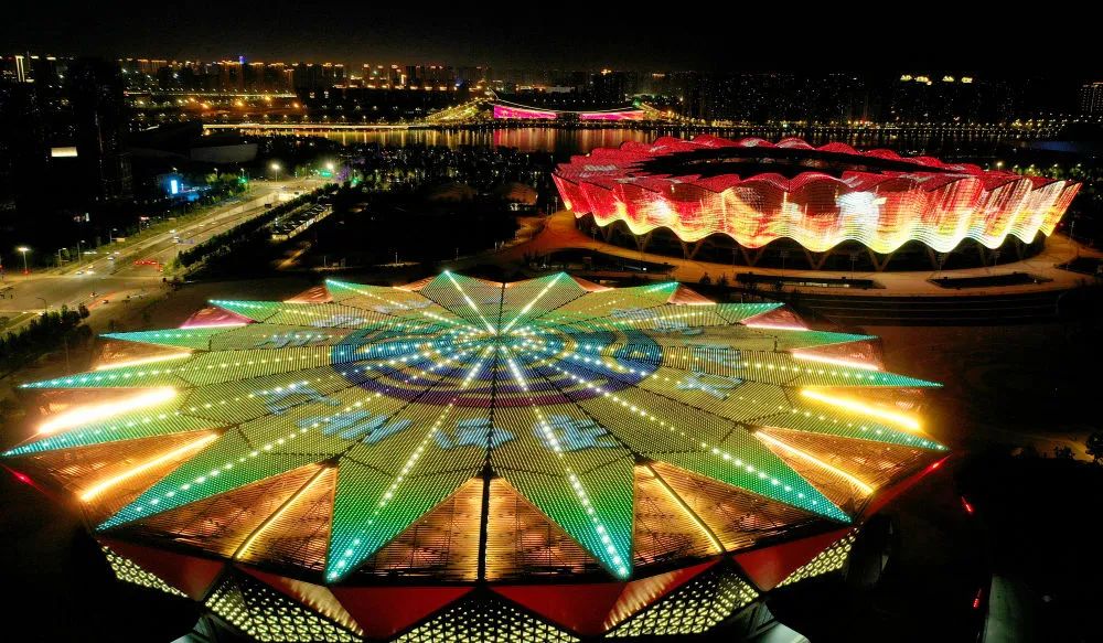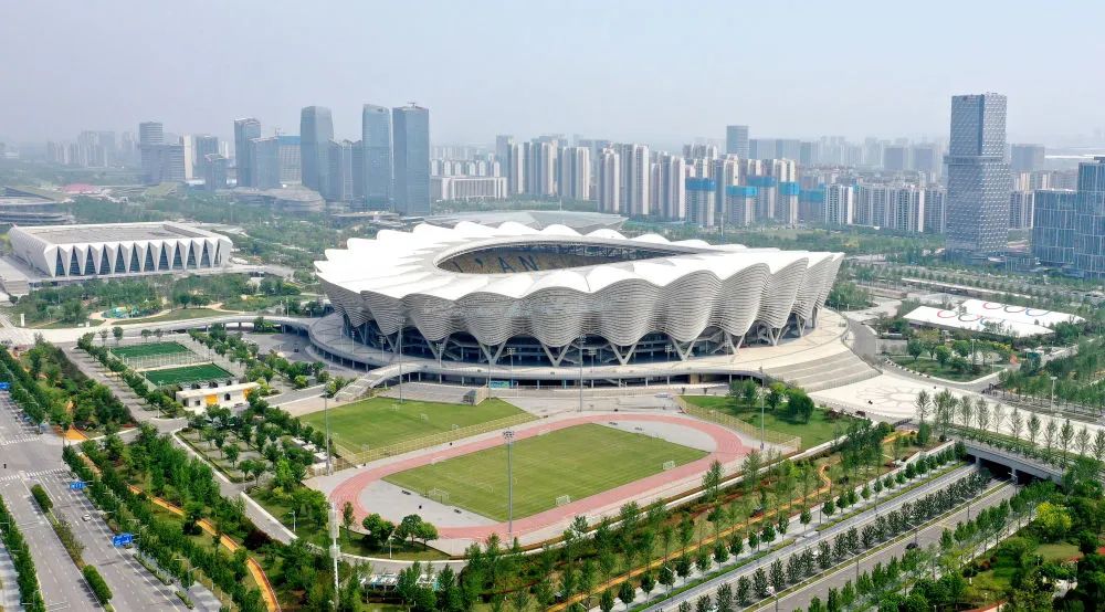 ↑位于西安國(guó)際港務(wù)區(qū)的西安奧體中心(4月26日攝,無(wú)人機(jī)照片)。新華社記者 劉瀟 攝