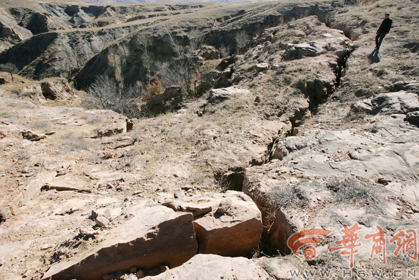 神木縣中雞鎮煤礦采空區地質坍陷造成的裂縫長達數公里,因為地下水流失,地表草木苦干。本報記者 鄧小衛 文/圖