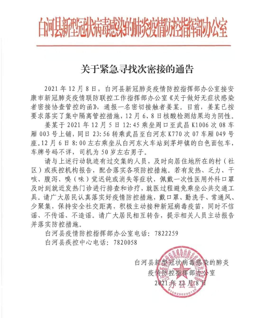 2021年12月8日,白河縣新冠肺炎疫情防控指揮部辦公室接安康市新冠肺炎疫情聯防聯控工作指揮部辦公室《關于做好無癥狀感染者密接協查管控的函》,通報一名密切接觸者姜某。目前,姜某已按要求落實了集中隔離管控措施,12月6、8日核酸檢測結果均為陰性。
