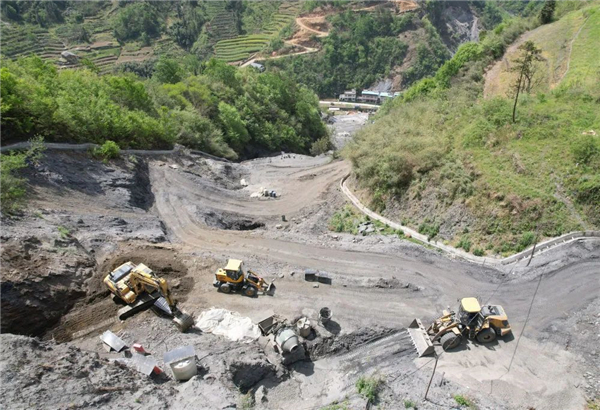 ↑4月9日,在白河縣卡子鎮鳳凰村一處廢棄硫鐵礦污染治理施工現場,工人在清理排洪渠。