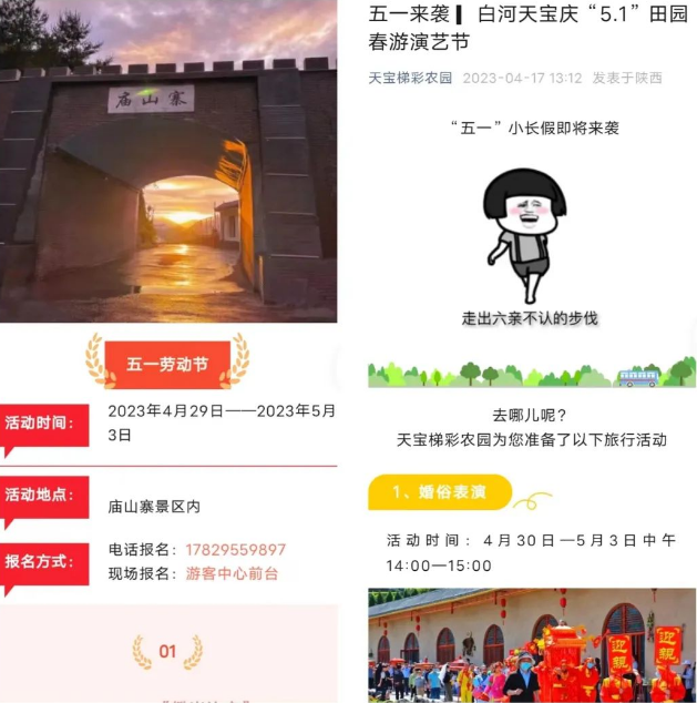 景區景點開放到位。“五一”期間,3家A級景區景點全部正常開放。其中天寶4A景區從4月29日至5月3日籌備舉辦田園春游演藝節系列活動,推出門票七折優惠措施;廟山寨3A景區將舉辦“廟山”好聲音、攀巖比賽等節慶活動,推出138元游玩通票打五折、門票+餐飲立減等優惠措施。Lek安康新聞網