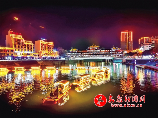 夜色漸濃,河堤兩岸被千盞燈籠裝飾一新,吉祥如意景觀燈廊,十二生肖、盛世龍門等各式造型的燈飾以及十二生肖竹排,與嵐河、廊橋交織成一片璀璨星河,如夢如幻。不少市民游客駐足觀看、拍照打卡。