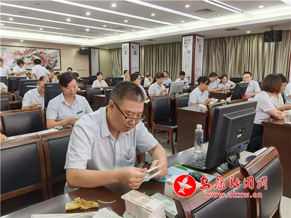 據(jù)了解,此次比賽設(shè)置了翻打百張傳票、字符錄入和手工點鈔、業(yè)務(wù)知識競賽四個項目。在翻打百張傳票和漢字錄入環(huán)節(jié),選手們靈巧的雙手在計算器和鍵盤上游走,伴隨著“噼里啪啦”敲擊聲,只見一個個數(shù)字答案輸入考試系統(tǒng),一行行字符在電腦屏幕上快速跳動。在點鈔比賽中,選手們單指單張、多指多張等多種點鈔手法各顯風(fēng)采,清點、墩齊、扎把、蓋章,每個步驟都環(huán)環(huán)相扣,一絲不茍,嫻熟的手法讓人目不暇接,印象深刻。