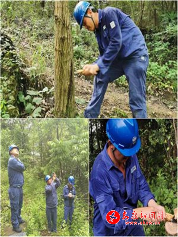 在悶熱難耐的綠樹山林間,他們頭戴藍色的安全帽,身著長袖長褲的工作服,不停揮舞著砍刀、電鋸,背上被浸濕的水跡,已分不清是汗水還是雨水,木屑飛舞,刀起刀落,伴隨著“轟轟轟……”的聲音,一顆顆超高樹木倒下,一條條線路通道暢通了。這不辭辛勞、團結(jié)合作的工作場景幾乎每天都能在山林里看到。
