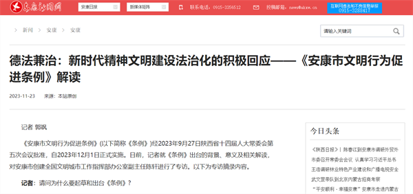 2023年,安康新聞網(wǎng)站準(zhǔn)確刊播政策消息,保證了政務(wù)消息、惠民消息及時(shí)準(zhǔn)確地傳播。發(fā)揮黨媒資源優(yōu)勢(shì),準(zhǔn)確闡釋解讀市委、市政府的重要決策和惠民政策,刊出《德法兼治:新時(shí)代精神文明建設(shè)法治化的積極回應(yīng)——〈安康市文明行為促進(jìn)條例〉解讀》《安康市2023年義務(wù)教育階段學(xué)校招生入學(xué)政策解讀》,從群眾關(guān)切入手,提升媒體服務(wù)質(zhì)量和為民服務(wù)意識(shí)。