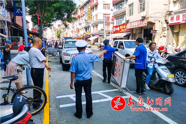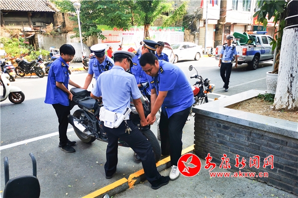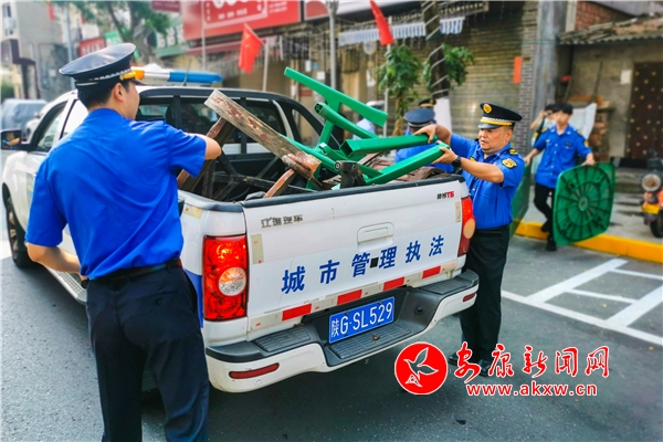 8月2日,漢濱區老城街道聯合、城管、公安、交警、市場監督管理局等部門在東正街開展亂停亂放、出店經營、環境衛生清理整治。(張昊 汪海玉)
