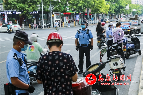 8 月1 日,交警中隊派員在城區十字路口,檢查違法違紀車輛。(李春江)