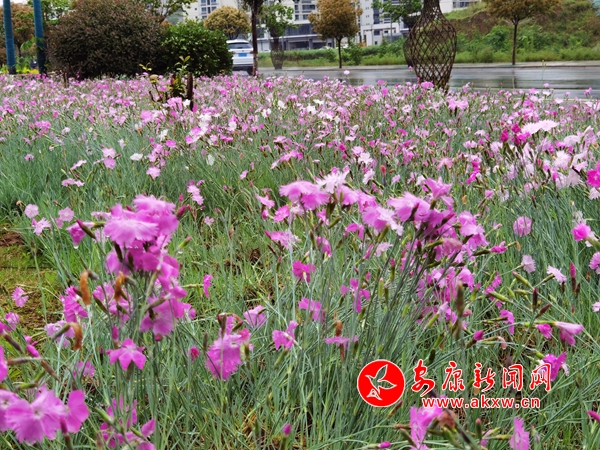 最美人間四月天。4月22日,陰雨綿綿,漢陰縣花月灣迎賓公園步道邊月季花、蝴蝶花、石竹子花綻放,在蒙蒙細雨的滋潤下,格外妖嬈,市民漫步其中,悠然自得。(通訊員 林愛銘)