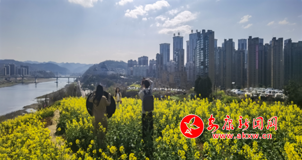3月10日,安康城區安瀾樓西側江邊油菜花綻放,與碧水藍天相映成趣。(圖文/陳德模 羅德紅)
