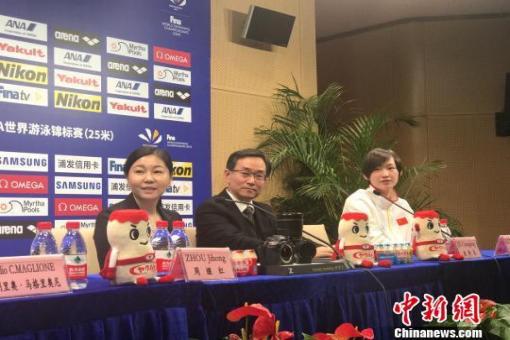 中國游泳協(xié)會(huì)主席周繼紅(左1)和李冰潔(右1)出席發(fā)布會(huì) 馬元豪 攝 中新網(wǎng)杭州12月11日電 (馬元豪)2018年國際泳聯(lián)世界游泳錦標(biāo)賽(25米)(以下簡(jiǎn)稱短池世錦賽)……