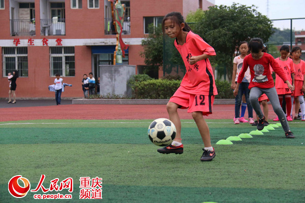 9月8日,重慶石柱縣三河鎮小學五年一班教室內,墻上的時鐘指向下午四點,走廊上的下課鈴準時打響,小穎(化名)拿著書包,迅速跑到球場邊的更衣室,換上球衣、球襪、球鞋。看著鏡子中的自己,小小的個子有著認真的表情和堅定的眼神,她滿意的點點頭,來到了足球場上,圍繞著教練放置的足球訓練標志碟開始熱身。