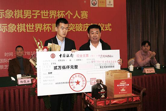 當天的活動中,山東景芝酒業股份有限公司董事長劉全平為丁立人和卜祥志頒獎。他透露,以后會重點加強與棋類項目的合作,為國際象棋事業的發展貢獻自己的力量,“預祝中國國象隊取得更加輝煌的成就”。