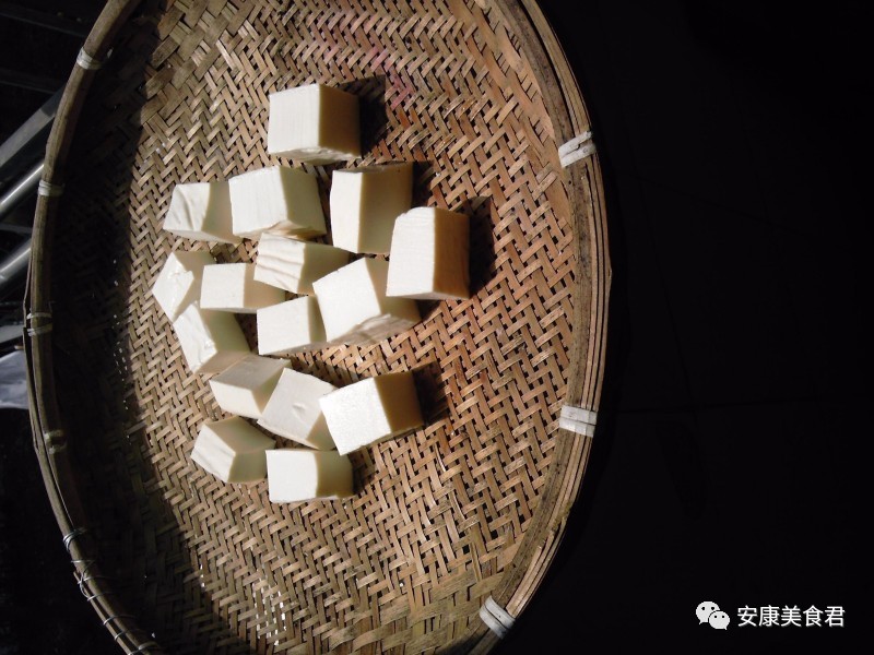 豆腐切塊,要切厚,上鍋干蒸,3至5分鐘,蒸的時間越長,豆腐里的水分越少,做出來的豆腐乳越硬,然后取出來晾著。