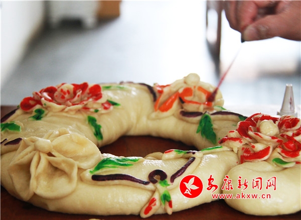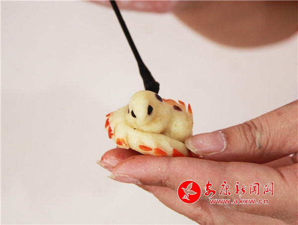 “做花饃先要做饃盤(基座),饃盤可大可小,一般有兩個饅頭大,然后將發酵好的面團用手捏、用剪刀剪成各種花兒和鳥兒等圖案作為饃頂,如果面太軟,或者圖案太大,還需要用牙簽或者較大的竹枝從饃頂部插到饃盤上,以便固定不變形,最后放在籠屜上,蓋鍋后用大火蒸,待出鍋即成為造型生動的花饃。最后再進行上色,花饃形狀最多的是喜鵲、龍、鯉魚等,造型喜慶寓意吉祥。” 花饃技藝傳承人胡志霞說道。kQr安康新聞網