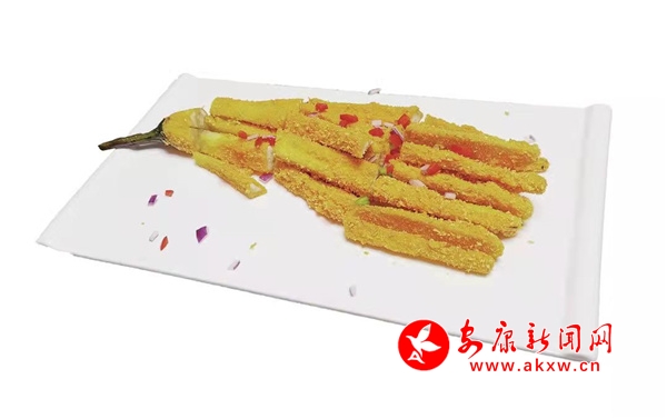 推薦理由:這道菜選用長形的紫氣皮茄子,削皮后橫豎刀切成佛手狀的粗條,均勻給每一根茄條拍上調味后的干淀粉、抹上雞蛋液,再裹上一層面包糠,下油鍋炸至表皮金黃,切成長短適合入口的大小,點綴上洋蔥碎和辣椒丁便可擺盤上桌了。菜品顏色金黃燦爛,看一眼便讓人食欲大開,夾一塊送入嘴中,外皮酥脆化渣,內部是茄肉的軟嫩多汁,茄子的香味透過面包糠的油香層層滲入口腔,余味悠長,是一道老少皆宜的美味佳肴。RY7安康新聞網