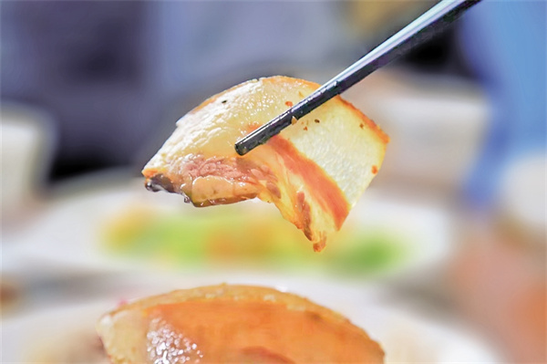 嵐皋臘味堪稱時間雕刻的藝術(shù),四季鎮(zhèn)的楊家院子里,當(dāng)?shù)孛考颐繎羧杂霉欧缰?ldquo;倒掛金鉤”。將土豬肉抹上花椒、橘子皮與苞谷酒,在巴山夜雨的潮潤與三冬暖陽的干燥間交替風(fēng)干三年。切片蒸熟的臘肉晶瑩剔透,肥瘦相間,咸香中暗藏果木幽香,入口爽嫩宜人,配以土灶新蒸的洋芋米飯,便是客路游子最深的鄉(xiāng)愁。小城的街頭同樣藏著流動的盛宴,冬日里挑擔(dān)叫賣的“烤紅薯”;北門坡老金家木槌現(xiàn)打的糯米飯團(tuán),在炭火上炙烤,待表面焦脆后填入芝麻糖餡;老菜市場樹蔭下的“漿巴饃”攤前,玉米漿發(fā)酵的酸香混著桐葉清香,勾住每個過路人的腳步。這些市井美味,構(gòu)成了嵐皋人記憶里的坐標(biāo)。