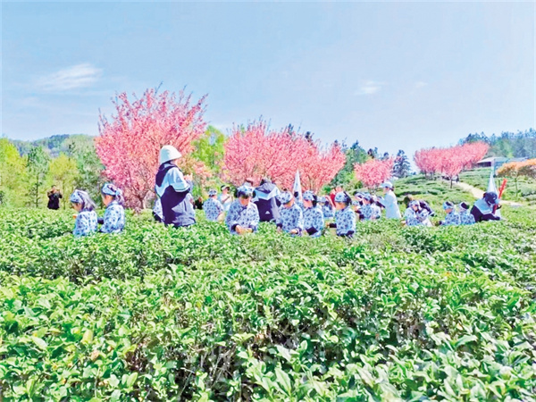 飯后陽光漫過茶壟的剎那,茶園正鋪展著千年的風(fēng)雅。我迫不及待換上采茶圍裙踏入皇茶園,體驗(yàn)采茶、做茶的樂趣。指尖輕捻“一芽一葉”的嫩綠,在古法炭焙的鐵鍋里翻涌著時(shí)光的溫度,待山泉水與雀舌相遇時(shí),茶香便化作裊裊云煙,在青瓷盞中演繹生命的涅槃。
