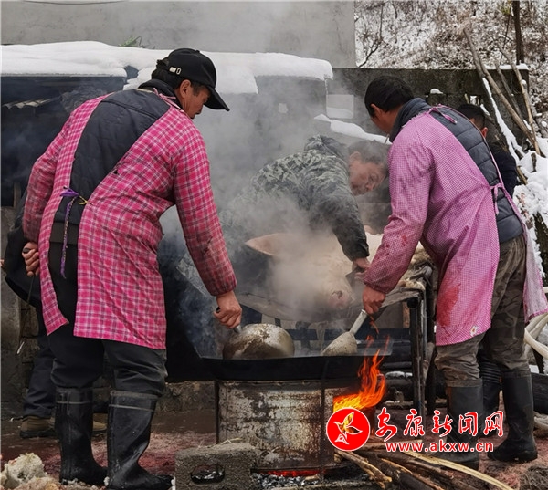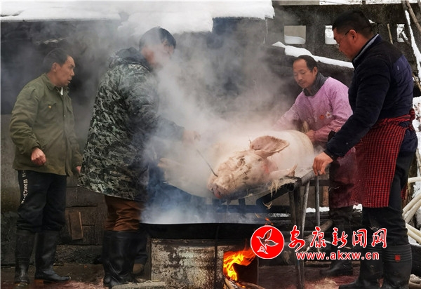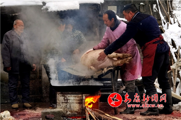 時(shí)逢陰歷十月初九,鎮(zhèn)坪縣迎來了入冬以來第一場降雪。漫天大雪,給原本氣溫偏低的化龍山腳下的張家坪增添了寒冷。然而,上竹鎮(zhèn)化龍村8組村民張成凱和叔叔張秀柱,卻帶著家人熱火朝天地忙著殺豬腌制臘肉,絲毫沒有寒冷的感覺。