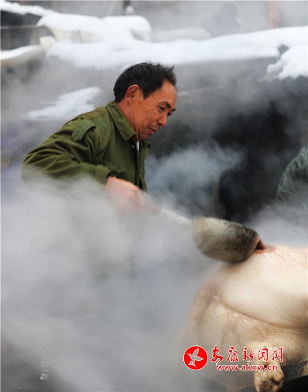 當(dāng)天,張成凱家一口氣殺了6頭豬,約1200斤,收入3萬多元;張秀柱家殺了2頭豬,400余斤,收入約1萬元。